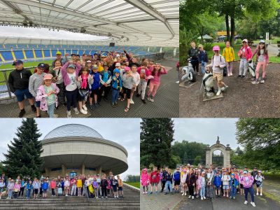 W poniedziałek 10 czerwca 2024r. wybraliśmy się na długo oczekiwaną wycieczkę do Planetarium – Śląskiego Parku Nauki w Chorzowie. Najpierw uczestniczyliśmy w seansie popularnonaukowym „Kometa nad Szwajcarską Doliną”, podczas którego obserwowaliśmy gwiazdy widoczne nocą nad naszymi głowami. Poznaliśmy wiele ciekawostek o kometach, a potem w dwu-lekcyjnych zajęciach obejrzeliśmy gwiazdy i gwiazdozbiory oraz Układ Słoneczny i jego składniki. Dowiedzieliśmy się między innymi dlaczego gwiazdy spacerują po niebie, kiedy Słońce wschodzi dokładnie w miejscu geograficznego wschodu, jak wraz ze zmianą pór roku zmienia się wygląd nocnego nieba. Poznaliśmy dokładnie teorię heliocentryczną Mikołaja Kopernika. Piękno kosmosu zachwyciło wszystkich. Być może ktoś z nas zostanie w przyszłości sławnym astronomem albo poleci na Księżyc? Następnie udaliśmy się do Śląskiego Zoo, gdzie oglądaliśmy różne gatunki zwierząt. Na sam koniec pojechaliśmy pod Stadion Śląski, gdzie weszliśmy na punkt widokowy i uświadomiliśmy sobie jak ważne i wielkie wydarzenia są tam organizowane. Wróciliśmy późnym wieczorem zmęczeni, ale zadowoleni. Wrażenia jakich doświadczyliśmy podczas tej wyprawy z pewnością pozostaną z nami na długo.
