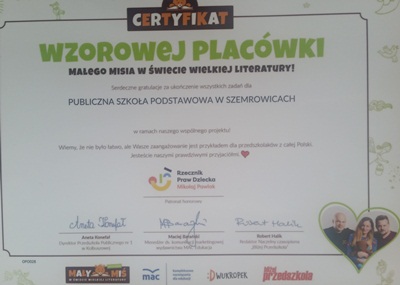 Grupa młodsza realizowała w tym roku projekt edukacyjny pod nazwą :”Mały miś w świecie wielkiej literatury”. Projekt ten został objęty patronatem honorowym przez Rzecznika Praw Dziecka. Organizatorem projektu w roku szkolnym 2019/2020 była Aneta Konefał, dyrektor Przedszkola Publicznego nr 1 w Kolbuszowej oraz Grupa MAC S.A. wydawcą miesięcznika „Bliżej Przedszkola”. Projekt zawierał 8 modułów do zrealizowania z dziećmi w grupie. Dzieci wraz z wychowawczynią zrealizowały wszystkie moduły. Ostatnie były już wypracowane w formie online w grupie. W związku z tym miło nam poinformować iż za pełną realizację projektu przyznano nam: CERTYFIKAT WZOROWEJ PLACÓWKI.