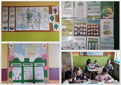 Dnia 21 kwietnia w świetlicy szkolnej obchodziliśmy DZIEŃ ZIEMI – najważniejsze i największe ekologiczne święto świata. Zajęcia rozpoczęły się krótką pogadanką i prezentacją multimedialną dotyczącą dbania o naszą planetę, poruszaliśmy tematy tj. : jak długo rozkładają się śmieci, co robimy z odpadami, co znaczy recykling, poznaliśmy znaczenie eko-symboli. Podsumowaniem zajęć była wspólna praca plastyczna z rolek i papieru stworzyliśmy przepiękne drzewa, które będą częścią dekoracji naszej świetlicy.