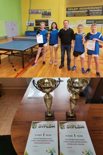 1 lutego w Gorzowie Śląskim odbyły się mistrzostwa w tenisie stołowym drużynowo igrzysk dzieci. Uczniowie ze szkoły z Szemrowic reprezentowali gminę Dobrodzień, zarówno w kategorii chłopców jak i dziewcząt. Na zawody zgłosiły się drużyny z Olesna, Gorzowa Śląskiego, Szemrowic i Rudnik. Mecze odbywały się systemem każdy z każdym do trzech wygranych pojedynków, składających się z meczy singlowych i debla. Dziewczęta wygrały wszystkie swoje mecze 3-0, pewnie zdobywając tytuł mistrza powiatu. Chłopcy pierwszy mecz z Rudnikami wygrali zdecydowanie 3:0. Pozostałe mecze były bardzo zacięte i wyrównane. Ostatecznie zarówno z Olesnem jak i Gorzowem Śląskim wygraliśmy po 3:2. W Gorzowie zgarnęliśmy pełną pulę zdobywając dwa mistrzostwa powiatu co jest historycznym osiągnięciem szkoły z Szemrowic. Obie nasze drużyny będą reprezentować powiat oleski na mistrzostwach województwa w Turawie. Szkołę reprezentowali: Chłopcy - Michał (klasa VII) i Kacper (klasa VI), dziewczyny: Agata (klasa VII) oraz Sofiia (klasa VI).