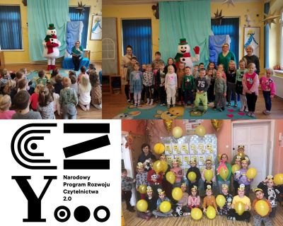 W lutym odbyły się w przedszkolu dwa działania wynikające z naszego Narodowego Programu Rozwoju Czytelnictwa . W grupie starszaków dnia 02.lutego świętowaliśmy : ”Dzień pozytywnego myślenia„ i byliśmy optymistami. Ten dzień poprzedziła akcja czytanych książek z serii: ”Uczucia Gucia- wraz z ćwiczeniami oddechowymi”. Gucio to jednorożec któremu zmienia się kolor grzywy w zależności od uczucia jakie nim włada. Dzieci bardzo pokochały tę serię i poprzez naszego małego bohatera z książki same starają się walczyć i pokonywać swoje słabości. Podczas naszego szczególnego dnia dzieci miały możliwość wysłuchania także opowiadania pt: ”Bajka o pozytywnym zajączku” oraz omówienie fragmentu komiksu bajki: ”Śpiąca Królewna”-moc dobrych życzeń .Dzieci brały udział również w takich zabawach edukacyjnych jak: trening pozytywności; "Plecak pełen radości"; zabawa ruchowo -muzyczna przy piosence: "Smutny bałwanek"; tworzenie „Mega e- motek radości” wykorzystując kolorowe słomki i klocki (podział na dwie drużyny. Starszaki wykonały także pracę plastyczną pt: "Moja e-motka " – realizacja pracy podczas muzyki relaksacyjnej . Dzieci tworzyły : ”E- motkowe labirynty (kodowanie)” Cały dzień upłynął na pozytywnym myśleniu. Drugim działaniem ,w którym brały udział obydwie grupy przedszkolne było : ”Spotkanie z bałwankiem „ Odbyło się ono dnia: 01.lutego br .Przedstawicielki Gminnego Ośrodka Kultury, Sportu i Biblioteki Publicznej w Dobrodzieniu na czele z panią Agnieszką Hurnik oraz panią Moniką Kabat zorganizowały czytanie z udziałem postaci bajkowej . Dzieci wysłuchały opowiadania czytanego przez panią dyrektor biblioteki pt: ”Weekendowy bałwanek” .Postać bałwanka ilustrowała ruchem i gestem czytany tekst wraz z dziećmi. Przedszkolaki miały także możliwość wysłuchania opowieści o teatrze w interpretacji: ”Misia - pacynki”. Na zakończenie miłego spotkania dzieci zostały zaproszone do odwiedzin w Miejskim Domu Kultury w Dobrodzieniu oraz stanęły do wspólnego pamiątkowego zdjęcia. Serdecznie dziękujemy naszym gościom za miłą wizytę.