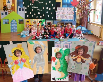 W grupie starszej obchodziliśmy ten dzień 07.listopada br. Wszystkie dzieci tego dnia przyszły do przedszkola przebrane za ulubione postacie ze swoich bajek .Był to dzień szczególnie obfitujący w liczne atrakcje i zabawy. Rozpoczęliśmy go krótką prezentacją multimedialną pt: ”Czy znam te bajki?” Słowa piosenki: ”Witajcie w naszej bajce…” zaprosiły następnie wszystkich przebierańców, aby przedstawili się i powiedzieli z jakiej bajki pochodzą. Była też :”Magiczna skrzynia rekwizytów bajkowych „ oraz „Bajkowy tor przeszkód”. Wspólnie wykonaliśmy także eksperyment badawczy pt:”Zatopione bajki”. Po wielu zmaganiach w grupie zostaliśmy zaproszeni na lekcję biblioteczną do naszej filii bibliotecznej w Szemrowicach. Tam dzieci rozpoznawały jakie uczucia kryją się w bajkach , oraz miały możliwość podświetlania lampką bajkowych zagadek . Na zakończenie wszyscy stanęliśmy do grupowego zdjęcia i pięknej foto budki. Dzieci otrzymały pamiątkowe dyplomiki i książeczki oraz pierniczki z domku Baby Jagi – za które dziękujemy naszej praktykantce : pani Kindze. Międzynarodowy Dzień Postaci Z Bajek jest jedną z wielu uroczystości realizowanych w oparciu o :”Narodowy Program Rozwoju Czytelnictwa „ który działa w naszym przedszkolu.