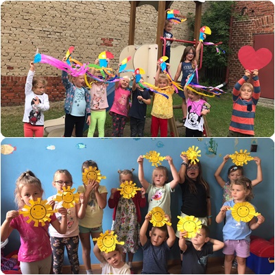W miesiącu lipcu w naszym przedszkoli odbywa się dyżur wakacyjny. Dzieci uczęszczające do przedszkola w wakacje mają mnóstwo chwil na integrację oraz zabawę z rówieśnikami. Ponadto, w trakcie wakacji mają okazję jeszcze częściej brać udział w zajęciach, w których wykorzystywane są elementy różnorodnych metod pracy, dostosowanych do ich wieku i indywidualnych możliwości. Letnie dni przynoszą wiele ciekawych pomysłów na spędzanie czasu w przedszkolu. Przedszkolaki biorą udział w zajęciach artystycznych między innymi :malowanie na folii w plenerze, rysowanie, tworzenie prac technicznych z wykorzystaniem różnych materiałów w tym przyrodniczych. Zabawy w plenerze powodują, że organizm dzieci jest bardziej dotleniony, a przez to usprawniają się wszystkie zachodzące w nim procesy. Gry i zabawy w plenerze dostarczają dzieciom okazji do „wyszalenia się” i rozładowania kumulującej się w nich energii. Spędzanie czasu na świeżym powietrzu jest, bowiem ulubioną formą aktywności większości naszych maluchów, dlatego, też każdy dzień wakacji w przedszkolu obfituje w atrakcje związane z aktywnością ruchową na świeżym powietrzu: zabawy na placu zabaw, tory przeszkód, piasek kinetyczny, bańki mydlane, zabawy z chustą animacyjną. Dzieci chętnie skaczą, biegają i tańczą wykorzystując metodę aktywnego słuchania muzyki wg. B. Strauss czy C. Orffa. Często bawimy się w teatr wykorzystując pacynki, gdzie dzieci same tworzą i przedstawiają wymyślone historie lub znane bajki. Zwykłe czytanie bajek stało się niezwykłe, bo dzięki pogodzie mogło odbywać się na kocu i trawie, pośród drzew i dźwięków natury .Każdy dzień jest dniem pełnym emocji, dobrej zabawy i nauki, bo tam, gdzie dzieje się wiele nieoczekiwanych i ciekawych rzeczy, nie ma mowy o nudzie!
