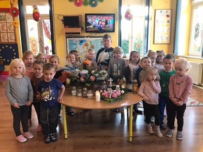 Grupa 3,4 latków wzięła w tym roku udział w akcji :”Szkoła Pamięta”. Przy dużej pomocy rodziców, którzy podarowali nam ozdoby i zielone gałązki zostały wykonane 2 stroiki . Dzieci pomagały przy ich dekorowaniu i ozdabianiu. Grupa obejrzała także film edukacyjny pt:”Karolek i Dzień Wszystkich Świętych” oraz wykonała pracę plastyczną techniką wydzieranki pt:”Znicz”.