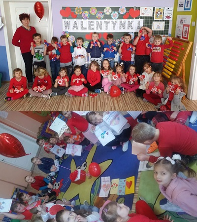 Aby podkreślić wyjątkowość daty wszyscy w naszym przedszkolu ubrali się w stroje w kolorze czerwonym. Na zajęciach rozmawiano o uczuciach, dzieci dowiedziały się czym jest serce i jaka jest jego rola. Brały udział w licznych konkursach: ”Pantofelek księżniczki”, ”Tańczące serca na wodzie”, ”Poszukaj swojej drugiej połówki”, obejrzały prezentację pt: ,,Walentynki– historia czy tradycja?”. Dodatkowo starszaki wrzucały do skrzynki: ”Poczta walentynkowa” przygotowane wspólnie z rodzicami kartki walentynkowe.