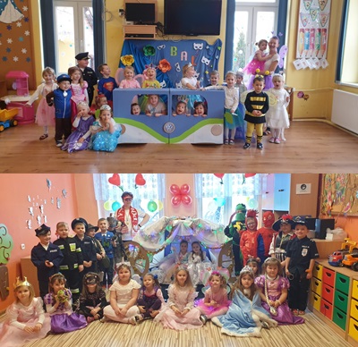 Wystrój sal przedszkolnych ozdobionych kolorowymi balonami oraz fotobudkami wprowadził wszystkich w radosny nastrój oraz zachęcił do wesołej zabawy. Na balu pojawili się bohaterowie znanych bajek. Można było spotkać wróżki, królewny, księżniczki, motylki, rycerzy, policjantów, Spider-Mana, diabełka i wiele innych ... nie sposób zliczyć i wymienić tych wyjątkowych gości. W przygotowanie bardzo ciekawych i pomysłowych strojów karnawałowych dla swoich pociech zaangażowali się rodzice.