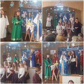 Tradycyjnie przed Świętami Bożego Narodzenia, czyli 20.12.2019r. odbyły się w naszej szkole jasełka przygotowane przez uczniów pod kierunkiem p. Haliny. W pięknie udekorowanej auli zebrali się wszyscy uczniowie oraz p. dyrektor Dorota Krawiec, ks. Proboszcz, Rada Rodziców, zaproszeni goście , nauczyciele, pracownicy obsługi i administracji. Publiczność po raz kolejny mogła przeżyć historię Maryi i Józefa. Młodzi aktorzy odegrali swoje role w sposób tak przekonujący, że wszyscy obecni z ogromnym zainteresowaniem śledzili losy Świętej Rodziny. Również chór pod batutą p. Aldony wprowadził obecnych w świąteczny, radosny nastrój. Ogromne zaangażowanie uczniów opłaciło się, gdyż przedstawienie to zostanie na długo w naszej pamięci.