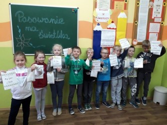 Dnia 10października 2019r. w świetlicy szkolnej odbyła się ważna uroczystość - „Pasowanie na Świetlika”. Jest to coroczna tradycja pasowania na świetlika uczniów klas pierwszych. Było miło i zabawnie. Uczennice z klasy II i III świetnie spisały się w roli prowadzących. Zajęły się częścią artystyczną. Kandydaci na świetlików musieli wykazać się znajomością smaku owoców i warzyw oraz regulaminu świetlicy, z czym poradzili sobie doskonale. Zwieńczeniem uroczystości był akt pasowania. Pierwszoklasiści złożyli przyrzeczenie, w którym deklarowali właściwe zachowanie i odpowiednią kulturę w świetlicy i szkole. Na pamiątkę każdy uczeń klasy pierwszej otrzymał medal z wizerunkiem świetlika oraz pamiątkowy dyplom. No i jeszcze na koniec małe co nieco– słodkie cukierki. Życzymy naszym nowym świetlikom samych przyjemnych chwil spędzonych w świetlicy.