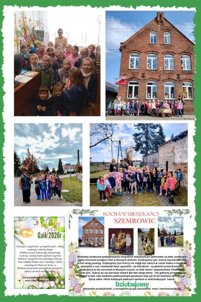 Przedszkolaki z Szemrowic już od ponad 25 lat kultywują w swoim regionie tradycję ludową jaką jest „Chodzenie z Gaikiem”. Zwyczaj ten wywodzi się z czasów dawniejszych niż chrześcijaństwo. Związany jest z obserwacją natury i odradzaniem się przyrody na wiosnę. Tak, jak marzanna jest symbolem przeganiania zimy, tak Gaik jest wprowadzeniem wiosny. Kolor zielony symbolizuje odrodzenie się przyrody. Kolorowe ozdoby akcentują różnicę między bujną wiosną, a martwotą zimy. „Chodzenie z Gaikiem” rozpoczęło się w naszym przedszkolu w 2001 roku. Stał się on wtedy nieodzownym elementem programu regionalnego: „Moja mała ojczyzna”, który realizowaliśmy w przedszkolu. W tym roku po raz kolejny starszaki rozpoczęły swoją przygodę z Gaikiem odwiedzając ponad 100 posesji mieszkańców Szemrowic. Dzieci w każdym domu składały świąteczne życzenia i śpiewały gaikową piosenkę. Każda Rodzina została obdarowana wielkanocną karteczką na pamiątkę. Chodzenie z Gaikiem to nie tylko kultywowane tradycji ludowej ale niesie ona ze sobą akcenty edukacyjne, społeczne i wychowawcze.