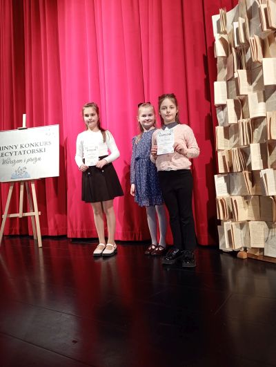 1 kwietnia 2025 w GOKSiBP w Dobrodzieniu odbył się gminny konkurs recytatorski szkół podstawowych pod hasłem: „Wierszem i prozą”. W zmaganiach konkursowych wzięła udział bardzo liczna grupa dzieci i młodzieży z naszej gminy. Klasy I-III zaprezentowały swoje umiejętności recytując dwa utwory poetyckie, zaś klasy IV-VIII utwór poetycki oraz dowolnie wybrany fragment prozy. Komisja konkursowa miała trudne zadanie, aby wyłonić zwycięzców i wyróżnionych uczniów. Poziom recytacji był bardzo wysoki, a przekrój wybieranych utworów literackich bardzo różnorodny. W kategorii klas I-III wyróżnienie otrzymała Samanta M. uczennica klasy III. Natomiast w kategorii klas IV- VI uczennica klasy V Julia S. zajęła 3 miejsce. Wszystkim uczestnikom gratulujemy! Dziękujemy również rodzicom za pomoc w dowiezieniu dzieci na konkurs.