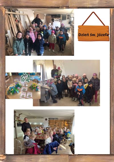 Św. Józef jest patronem: robotników, rzemieślników, cieśli, drwali i stolarzy. Tradycyjnie też tego dnia czyli 19 marca przedszkolaki wędrują do naszych stolarzy z okazji ich święta. Śpiewamy tradycyjne sto lat , składamy życzenia oraz wręczamy skromne upominki. Tego dnia maluszki odbyły także krótkie warsztaty stolarskie u tatusia naszej Alicji T. Obejrzeliśmy maszyny oraz wysłuchaliśmy opowieści stolarza. Warsztaty odbyły się w ramach doradztwa zawodowego. Serdecznie dziękujemy za miłe i serdeczne przyjęcie .