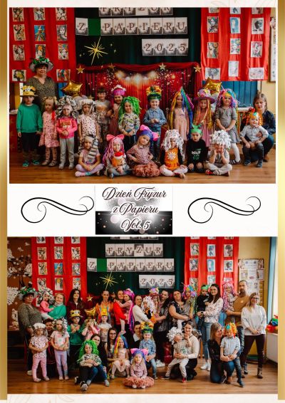 Ten fascynujący projekt artystyczny realizowany był grupie młodszej przez cały tydzień czyli od 04-11 marca 2025r. Dzieciom w tym czasie dawkowaliśmy codziennie nowe i ciekawe informacje . Wprowadzeniem w realizację projektu były przeprowadzone w grupie warsztaty fryzjerskie z panią fryzjerką w roli głównej. Następnie nasze maluszki dowiedziały się skąd bierze się papier? i dlaczego trzeba go oszczędzać?. Były zajęcia ekologiczne związane z tematem: co nam dają drzewa i do czego są nam potrzebne?. Dzieci wykonały 3 prace plastyczne tworząc swoje fryzury z papieru. Uwieńczeniem naszych zmagań była uroczysta gala pokazu fryzur z papieru z udziałem Rodziców i Opiekunów. Dzieci wykonywały fryzury z papieru nie tylko w przedszkolu ale w projekt zaangażowali się także Rodzice a nawet całe Rodziny tworząc wymarzone fryzury dla naszych przedszkolaków. Był to niewątpliwie czas twórczej zabawy w Rodzinie. Dnia 11 marca br. zebraliśmy się aby integrować się i bawić wspólnie z naszymi pociechami . Każdy Rodzic otrzymał specjalny :”darmowy bilet wstępu” na naszą galę. Były gry i zabawy przy muzyce ale także ciekawe eksperymenty i zabawy ruchowe. Na zakończenie każde dziecko mogło zaprezentować swoją jedyną i niepowtarzalną papierową fryzurę krocząc specjalnie przygotowaną na ten dzień :”Aleją Gwiazd”. Były oklaski i wiwaty . Każde dziecko opowiadało z kim wykonywało swoje artystyczne dzieło .Każdy przedszkolak otrzymał pamiątkowy dyplom za udział w projekcie oraz statuetkę:” Gwiazdy „. Nie zabrakło także pamiątkowych zdjęć przy ściance fotograficznej. Bardzo serdecznie dziękuję wszystkim Rodzicom za tak wielkie zaangażowanie się w nasz projekt i pracę w niego włożoną. Jesteście Wielcy.