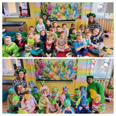 W naszym przedszkolu odbył się wyjątkowy Dzień Dinozaura, który dostarczył dzieciom mnóstwo radości i niezapomnianych wrażeń. Tego dnia przedszkolaki przyszły przebrane za dinozaury. Kolorowe stroje i kreatywne pomysły sprawiły, że sala zamieniła się w prawdziwy prehistoryczny świat. Dzieci uczestniczyły w wielu ciekawych aktywnościach. Poznały nazwy i zwyczaje dinozaurów, oglądały ilustracje oraz słuchały ciekawostek o ich życiu miliony lat temu. Nie zabrakło również zabaw ruchowych, „dinozaurowych”. Radość i zaangażowanie były widoczne na twarzach wszystkich dzieci. To był dzień pełen uśmiechu, dobrej zabawy i nowych odkryć.
