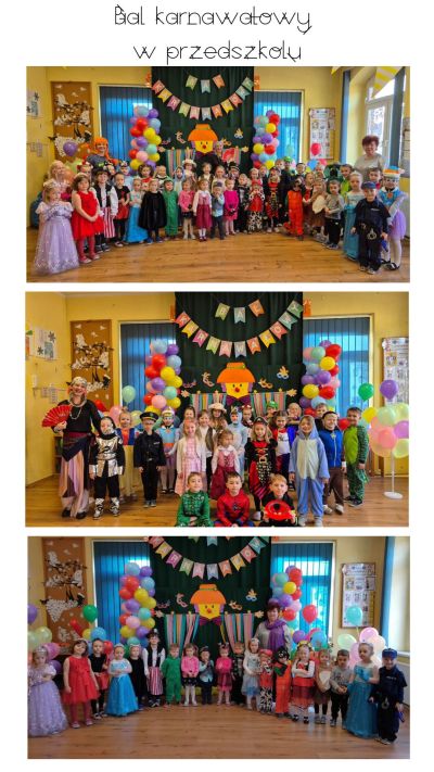 Karnawał to czas balów i tanecznych szaleństw, którym towarzyszy muzyka i zabawa. Dzieci z naszego przedszkola również miały okazję wspólnie zintegrować się na balu. Dla przedszkolaków to dzień szczególny, ponieważ ten czas grupy łączą się w jednej sali, by spędzić ze sobą miłe i przyjemne chwile, a przy okazji poczuć zdrową rywalizację w czasie konkursów, quizów i innych ciekawych zabaw. Dzieci tego dnia miały okazję przebrać się za różne postacie z bajek i nie tylko. Na balu można było spotkać: wróżki, księżniczki, biedronki, rycerzy, policjantów, strażaków i wiele innych postaci. Przedszkolaki świetnie bawiły się w rytm muzyki porywającej do tańca. Bajkowa atmosfera na długo pozostanie w pamięci naszych pociech. Dziękujemy Radzie Rodziców za poczęstunek dla Naszych najmniejszych