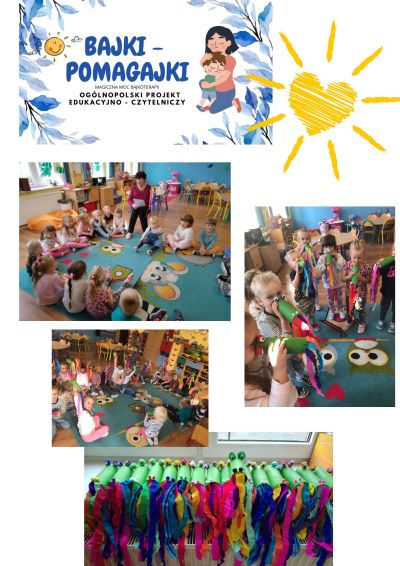 Grupa młodsza przyłączyła się w tym roku szkolnym 2024/2025 do Ogólnopolskiego Projektu Edukacyjno- Czytelniczego :”Bajki Pomagajki –czyli magiczna moc bajkoterapii. Projekt jest realizowany w grupie od września 2024 do kwietnia 2025. W ciągu tych 8 miesięcy dzieci słuchać będą wielu bajek. Są to niezwykłe historie dotyczące konkretnych problemów, emocji z którymi dzieci niejednokrotnie się borykają. Nie są zakończone morałem, ale młodzi słuchacze takich bajek mogą utożsamić się z bohaterem i przeżyć z nim daną sytuację, pozostając w bezpiecznym miejscu blisko nauczyciela. Bajka – pomagajka oswaja z emocjami i problemami bohaterów, a co ważniejsze zawiera wiele wskazówek, co można zrobić, by poradzić sobie w danej sytuacji. Głównym celem bajkoterapii jest ochrona i wzmacnianie rozwoju psychicznego dziecka. Dzieci poznały już : wrzesień :”Kocica złośnica nie chce chodzić do przedszkola”( porusza problem adaptacji ); październik :”Jacek , mucha i trzy smoki”( porusza temat bezpieczeństwa dzieci w domu). Po każdej bajce przedszkolaki wykonują pracę plastyczną związaną z przesłaniem bajkowym . Wszystkie bajki terapeutyczne czytane przez nauczyciela są do wglądu rodziców i wiszą na gazetce przedszkolnej.