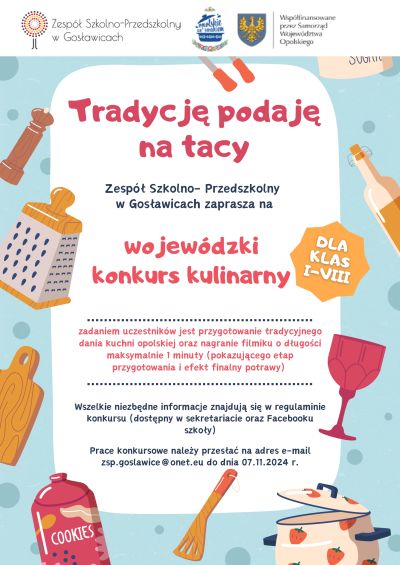 Zespół Szkolno-Przedszkolny w Gosławicach oraz Stowarzyszenie Kreatywnej Edukacji mają zaszczyt zaprosić Państwa na Wojewódzki konkurs kulinarny ,,Tradycję podaję na tacy" dla klas I-VIII.