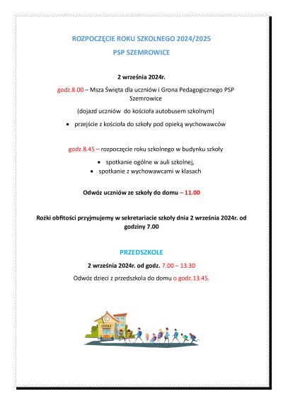 Na koniec kochani Pierwszoklasiści pragnę jeszcze zwrócić się do Was. Witam Was w Publicznej Szkole Podstawowej w Szemrowicach, szkole w której zaczyna się Wasza najlepsza droga do dobrej przyszłości. Mam nadzieję, że szybko zaaklimatyzujecie się tutaj i stanie się ona dla Was drugim domem. Wierzę również, że będziecie mogli realizować tutaj swoje cele, zdobywać rzetelną wiedzę i spełniać marzenia.