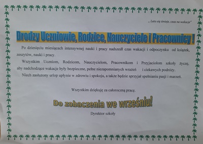 Życzę Wam wytrwałości w dążeniu do celu i wielu sukcesów, które będą dla Was powodem do dumy. Mam nadzieję, że gdy nadejdą kolejne wakacje, każdy z Was będzie mógł z satysfakcją spojrzeć na miniony rok i powiedzieć: To był dla mnie dobry rok! Wierzę, że pomogą Wam w tym Wasi Nauczyciele, a także Rodzice którzy będą dla Was wsparciem w rozwiązywaniu każdej sprawy. Wam drodzy Nauczyciele życzę cierpliwości i wytrwałości w codziennej pracy.