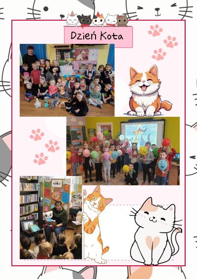 Światowy Dzień Kota to święto obchodzone 17 lutego, np. we Włoszech i Polsce. Ma ono podkreślić znaczenie kotów w życiu człowieka, niesienie pomocy wolno żyjącym i bezdomnym zwierzętom, które miały kiedyś dom, ale go straciły, a także uwrażliwienie ludzi na często trudny koci los. W tym roku obydwie grupy przedszkolne obchodziły ten dzień bardzo uroczyście . W grupie starszej dzieci oglądały prezentację pt: ”Poznaj mojego kota”. Wykonały pracę plastyczną :”Mozaikowy kotek” .Były również zabawy muzyczno-ruchowe z balonami , które zamieniły się w kotki . Starszaki wzięły także udział w teleturnieju wiedzy o kotach. W grupie młodszej uroczystość ta wpisana jest w realizowany w grupie projekt edukacyjny pt: ”Kreatywne dni nietypowe” i jest kolejną piękną edukacyjną zabawą. Dzieci młodsze obejrzały w tym dniu film edukacyjny pt: ”Kot” i poznały historię kota domowego. Poznawały także bardzo ciekawe kocie zmysły i rasy kotów. Wychowawczyni przygotowała im bajkową zgadywankę :”Z której bajki pochodzi ten kot?” Były koty z dawnych bajek np. Filemon i Bonifacy ale także były koty z najnowszych bajek np. kotka Marlena z bajki pt: ”Piorun” .Były zabawy muzyczne z kocimi przebojami . Dzieci wykonały 2 prace plastyczne :”Kotek nocą” i „Kotek na patyczku”. Ważnym wydarzeniem w tym dniu była także wizyta w bibliotece gdzie zaproszono nas na urodziny Kici Koci . Pani Kasia z biblioteki przygotowała dla dzieci również mnóstwo atrakcji . Min było:” Bajkowe koło fortuny” ”Zakodowane bajki”. Maluszki na pamiątkę tego wesołego i figlarnego dnia otrzymały dyplomiki z wizerunkiem kotka .Obydwie grupy otrzymały także słodkie poczęstunki, za które dziękujemy.