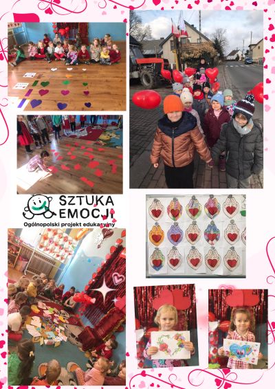 W grupie młodszej od października 2023r jest realizowany projekt pod hasłem: ”Sztuka emocji”. Grupa ma przewidzianych 8 zadań do zrealizowania do końca roku szkolnego. Zadania polegają na przedstawieniu 8 emocji za pomocą 8 wybranych dziedzin sztuki. Korzystając ze święta walentynkowego maluszki w miesiącu lutym połączyły :ODWAGĘ z MUZYKĄ i stworzyły walentynkową orkiestrę. Odważnie zagrały na instrumentach do piosenki :”Siła przyjaźni” dedykując ją wszystkim zakochanym i przyjaciołom Przedszkola. W tym wyjątkowym dniu działała u nas walentynkowa poczta. Dzieci przyniosły do przedszkola swoje walentynkowe karteczki i wrzucały do specjalnej tuby , która wypełniona była po brzegi. Każdy otrzymał walentynkę nie tylko od przyjaciela, ale także od wychowawczyni. Dzieci brały udział w walentynkowych konkursach i zabawach . Wykonywały mnóstwo prac plastycznych. Rozmawialiśmy dużo o przyjaźni i dobroci oraz o sposobach jej okazywania innym. W związku z tym maluszki wybrały się na walentynkowy spacer z balonikami w kształcie serca i karteczkami wypełnionymi:” dobrym słowem” . Podawały i rozsiewały dobro wszystkim napotkanym osobom po drodze rozwijając w ten sposób inteligencję emocjonalną .Z walentynkami związany jest także konkurs plastyczny pt” Miłość w kopercie „ do którego zapisało się 3 przedszkolaków: Ania D. , Michalina D. i Nikodem Z. Konkursowe prace wysłano do organizatora i właśnie w walentynki nastąpiło rozstrzygnięcie konkursu .Nasi milusińscy są dla nas już wygrani , a od organizatora konkursu w najbliższych dniach otrzymają specjalny dyplom za udział. Przed grupą: ” Wiewióreczki” jeszcze ostatnie 3 zadania z projektu :”Sztuka emocji”. W marcu: SPOKÓJ – RZEŻBA ; w kwietniu: GNIEW- LITERATURA i w maju: PODZIW- TANIEC. Dzieciom bardzo spodobał się projekt i z chęcią wykonują wszystkie zadania z modułów projektu.