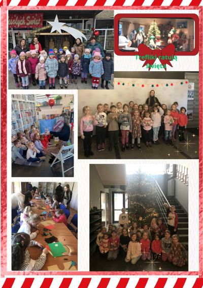 Seans filmowy odbył się w ramach projektu: ”Młode Horyzonty”. Film był adaptacją uniwersalnego przesłania „Opowieści wigilijnej” dostosowanej do wrażliwości najmłodszych widzów. W przesłaniu filmu można było zauważyć połączenie nauki ważnych wartości takich jak: wyrozumiałość; empatia oraz siły przyjaźni ,która podczas Świąt jest ogromnie ważna. Po filmie starszaki zostały zaproszone do biblioteki gdzie odbyły się warsztaty czytelniczo-plastyczne. Pani Renata Kudełka oprowadziła dzieci po bibliotece oraz przeczytała nam książkę pt:”Gwiazdka”. Następnie podczas warsztatów plastycznych dzieci samodzielnie ozdabiały drewniane zawieszki na choinkę. Serdecznie dziękujemy wszystkim osobom zaangażowanym w realizację tej pięknej przygody.