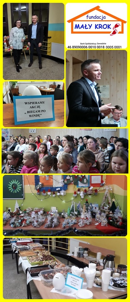 W czasie Adwentu, przy współpracy z Rodzicami zorganizowany został w naszej szkole kiermasz świąteczny dekoracji i ozdób Bożonarodzeniowych oraz przepysznych pierników. Celem było wsparcie akcji Dyrektora Zespołu Szkół Specjalnych w Zawadzkiem pod hasłem „ Biegam po windę”. Dnia 11 stycznia 2024r podczas wywiadówki podsumowującej pierwsze półrocze, na której rodzice i zaproszeni goście mieli okazję zobaczyć inscenizację Jasełkową w wykonaniu uczniów naszej szkoły, Pani Dyrektor wraz z nauczycielami oraz pracownikami administracji i obsługi przygotowali dla wszystkich zaproszonych gości poczęstunek. Podczas spotkania można było złożyć dobrowolną cegiełkę na windę. Podsumowując całą akcję, która miała miejsce w naszej szkole ostatecznie na szczytny cel zebrano 2800 zł. Dziękujemy wszystkim za pomoc i zaangażowanie.