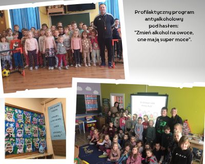 Przedszkolaki z PSP Szemrowice przez cały tydzień uczestniczyły w programie antyalkoholowym. Program polegał na tym, aby uzmysłowić dzieciom zagrożenia wynikające ze złych nawyków, zwanych „uzależnieniem”, oraz pokazać, rozwiązania zastępcze, które prowadzą do tego, że pozbywamy się nawyków negatywnych zamieniając je na zdrowy tryb życia. Wszystkie działania prowadzone w grupach przedszkolnych były prowadzone przez cały tydzień, we współpracy nauczycieli i psychologa szkolnego PSP Szemrowice. Zajęcia przeprowadzone w grupach miały na celu dostarczenie dzieciom podstawowej wiedzy na temat „używek” i jego oddziaływania na organizm człowieka. Poprzez zabawy edukacyjne, teatrzyki, quizy i konkursy dzieci świadomie wybierały hasła promujące zdrowy tryb życia. Aktywnie uczestniczyły w zajęciach sportowych przygotowanych przez p.Waldemara – nauczyciela w-f w szkole, oraz słuchały i nabierały wiedzy w czasie prelekcji i zajęć przygotowanych przez p.Anię – psycholog szkolną. Wykonywały prace plastyczne oraz plakat, który podsumował wszystkie działania dzieci prowadzące do zrozumienia i znaczenia zdrowego stylu życia. Wszystkie zamierzone cele zostały osiągnięte. Dziękujemy wszystkim nauczycielom, którzy aktywnie uczestniczyli w pozyskaniu wiedzy i umiejętności naszych przedszkolaków.