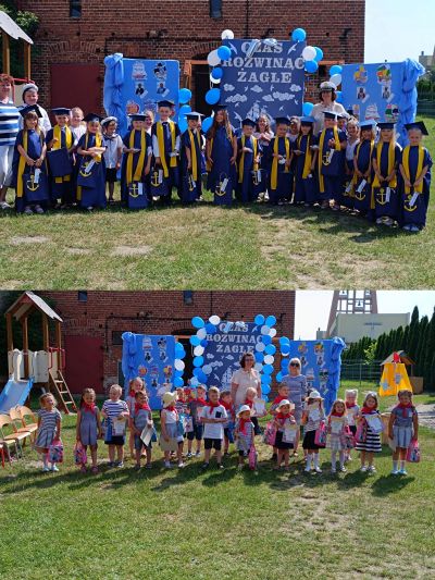 22 czerwca 2023r. w naszym przedszkolu odbyła się uroczystość zakończenia roku przedszkolnego oraz pożegnania absolwentów pod hasłem :”Czas rozwinąć żagle”. Dziesięć miesięcy wspólnych zabaw i zajęć, podróży po porach roku szybko minęło i nadszedł czas pożegnań i wakacji. W uroczystości zakończenia roku w przedszkolu uczestniczyli: rodzice dzieci, dyrekcja, nauczyciele i personel obsługi. Na początku wystąpiły dzieci z grupy młodszej, zagrały na instrumentach do wakacyjnej piosenki, wierszykiem pożegnały starszych kolegów kończących przedszkole oraz popisały się tańcem żeglarzy. Następnie rozpoczął się występ grupy starszej. Były wiersze, piosenki i tańce, które zachwyciły wszystkich. Po części artystycznej przyszedł czas na podziękowania dla rodziców, którzy udzielali się bezinteresownie i byli zaangażowani w działania na rzecz placówki. Otrzymali Oni piękne dyplomy. Po występach wszystkie dzieci otrzymały dyplomy oraz nagrody – niespodzianki. Kolejni absolwenci naszego przedszkola opuszczają nas, by rozpocząć po wakacjach naukę w klasie pierwszej. Życzymy im wielu sukcesów i spełnienia marzeń, a wszystkim dzieciom bezpiecznych i radosnych wakacji. Pamiętajcie o nas i przedszkolu.