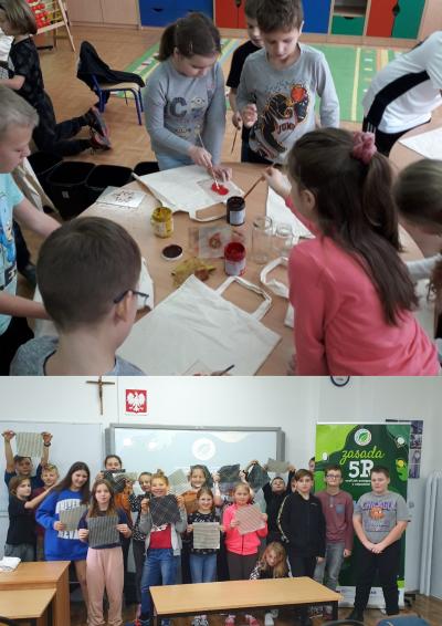 W piątek 25.11 w naszej szkole odbyły się warsztaty ekologiczne. Zajęcia odbyły się w dwóch grupach. Pierwszą grupę stanowiły klasy 1-4, a drugą klasy 5-7. Uczniowie pogłębili swoją świadomość ekologiczną oraz poznali zasady postępowania z odpadami. Zajęcia miały również charakter praktyczny. Grupa młodsza tworzyła ekotorby, które są przeznaczone do wielokrotnego użytku. Natomiast grupa starsza ze starego, nieużytkowanego materiału tworzyła opakowania, w których można przechowywać żywność.