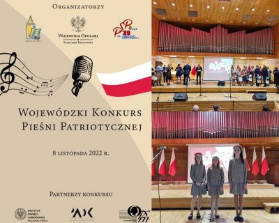 8 listopada w sali koncertowej Państwowej Szkoły Muzycznej w Opolu miał miejsce finał Wojewódzkiego Konkursu Pieśni Patriotycznej. Brali w nim udział uczniowie szkół podstawowych i ponadpodstawowych z województwa opolskiego. Była to niekonwencjonalna lekcja patriotyzmu, lekcja szacunku dla wszystkich tych, którzy na przestrzeni wielu wieków walczyli o wolną i niepodległą Polskę. Nasze uczennice: Hanna, Patrycja i Paulina zajęły III miejsce wykonując utwór pt.: „Ojczyzno ma”. GRATULUJEMY!!!