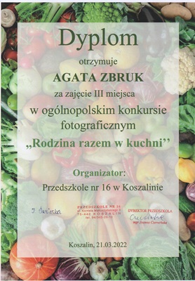 W naszej grupie starszaków zgłosiły się dwie uczestniczki Agata Z. i Eliza J. Zadaniem konkursowym było zorganizowanie w domu rodzinnym wspólnego gotowania, a następnie sfotografowanie tej chwili. Liczył się pomysł, kreatywność, ujęcie, promocja wspólnego gotowania i zaprezentowanie zdrowego odżywiania.