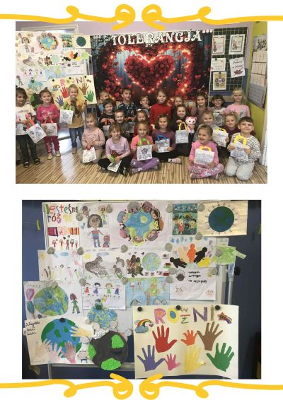 W szczególny sposób podczas zajęć i zabaw zwracaliśmy uwagę na dobre cechy i zalety dzieci Było także rozwiązanie konkursu plastycznego pt:” Inny -nie znaczy gorszy” w który włączyli się także Rodzice. Wszystkie dzieci otrzymały dyplomy oraz upominki za wkład w ten trudny dla dzieci temat. Szukaliśmy słowa tolerancja także w czytanej bajce pt:”Brzydkie kaczątko”.