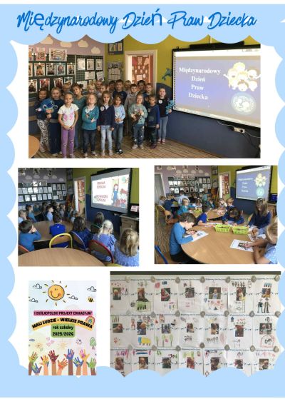 W grupie :”Odkrywcy” od września 2025r realizowany jest ogólnopolski projekt edukacyjny pt:”Mali ludzie –Wielkie prawa”. Grupa zrealizowała już wiele zadań projektowych a jednym z nich były warsztaty pt:”Moje prawa i obowiązki”. Z okazji zbliżającego się Międzynarodowego Dnia Praw Dziecka starszaki odegrały scenki pantomimiczne związane z obowiązkami dzieci, a następnie obejrzały film edukacyjny pt:”Karolek i prawa dziecka”. Wykonaliśmy także pracę plastyczną pt:”Moje ulubione prawa”. Wszystkie dzieci zaświeciły tego dnia niebieskim kolorem ubrań. Celem warsztatów było uświadomienie dzieciom znaczenia ich praw oraz okazywanie solidarności z dziećmi, których prawa sa naruszane.