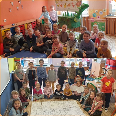 W tym roku Filip, który pasjonuje się dinozaurami i wie wszystko o tych wyjątkowych gadach na chwilę miał okazję zamienić się miejscem z wychowawczynią i opowiedzieć dzieciom o życiu dinozaurów. Dzieci układały mega kolorowankę i pokazywały swoje dinozaury o których też sporo wiedzą. Przez cały czas dzieci starały się odpowiedzieć na pytanie: Czy dziś żyją dinozaury? – odpowiedź jest prosta : nie, jednak czy aby na pewno? Teraz już wiemy, że dzisiaj żyją kuzyni dinozaurów i ta zagadka najbardziej przykuła uwagę naszych przedszkolaków. Wielka szkoda, że gady te wyginęły blisko sześćdziesiąt pięć milionów lat temu, po blisko 135 mln lat życia na naszej planecie. Dinozaury nadal przykuwają uwagę naukowców i myślę, że każdego z nas.