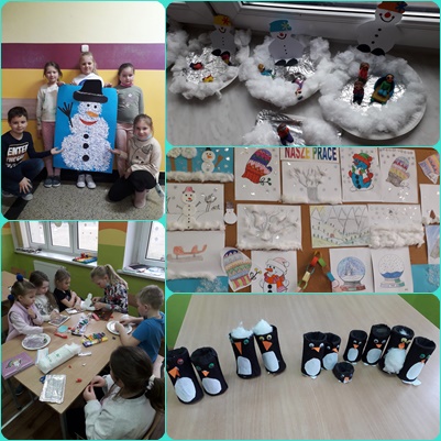 Styczeń w świetlicy był bardzo pracowity, gdyż zrobiło się u nas bardzo zimowo. Dzieci tworzyły przepiękne prace zimowe, wykorzystywały do tego przeróżne materiały, zaczynając od białej farby, jaka towarzyszyła nam w wielu pracach przez pastę do zębów, sztuczny śnieg, styropian, papierowe rolki, tacki po białe ścinki ze zużytych kartek papieru. Głównym tematem naszych zajęć były zabawy i sporty zimowe. Podsumowaniem całego cykl zajęć i zabaw była prezentacja multimedialna na temat „ Bezpieczne ferie zimowe”, którą dzieci zobaczyły przed rozpoczynającymi się feriami zimowymi.