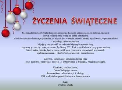 Boże Narodzenie to czas pełen dobroci, radości i uśmiechu. Dla każdego z nas, są to wyjątkowe i niezapomniane chwile. I choć w tym roku wiele się zmieniło, to w naszej szkole jedno pozostało niezmienne- Boże Narodzenie. W ten świąteczny czas Uczniowie nagrali wyjątkowe filmy, w których grają i śpiewają kolędy oraz czytają opis Bożego Narodzenia. Wszystkie nagrania w jedną całość skleił Patryk z VII klasy. Za Jego czas, poświęcenie i zaangażowanie, serdecznie dziękujemy. Bardzo dziękujemy również wszystkim Uczniom biorącym udział w tym przedstawieniu. Zapraszamy do zobaczenia filmu o Bożym Narodzeniu w wykonaniu Uczniów naszej szkoły.