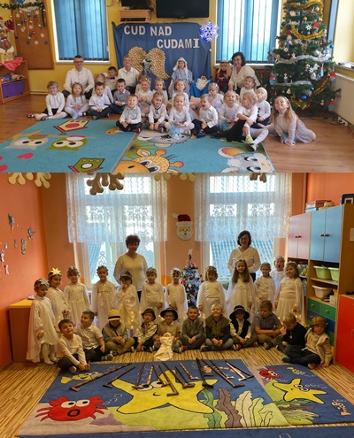Uroczystość Jasełek od wielu lat wpisana jest do kalendarza uroczystości organizowanych w naszym przedszkolu. W tym roku również postanowiłyśmy przeprowadzić tę uroczystość , integrując dom rodzinny i przedszkole, wprowadzając nastrój świąteczny oraz pokazując rodzicom umiejętność prezentowania przez dzieci swoich umiejętności wokalno – recytatorskich , tanecznych i muzycznych. Dnia 18 grudnia 2020 r. dzieci z obydwu grup wiekowych przedstawiły: Jasełka ( każda grupa w swojej sali). Chociaż sala tym razem nie była wypełniona rodzicami oni także mieli sposobność obejrzenia ich w formie online. Głównym celem tej uroczystości było wprowadzenie uczestników w radosną atmosferę Świąt Bożego Narodzenia, kształcenie umiejętności wyrażania uczuć i przeżyć podczas inscenizacji Jasełek, wzmacnianie więzi emocjonalnej z rodziną, rozwijanie indywidualnych predyspozycji i uzdolnień aktorskich dzieci oraz nabywanie odwagi i śmiałości podczas występów . Przedstawienie było wyjątkowe. Mali aktorzy we wspaniałych strojach prezentowali się doskonale. Nasi artyści śpiewali pastorałki i kolędy, wykonywali układy taneczno-ruchowe i grali na instrumentach. Na zakończenie uroczystości dzieci złożyły życzenia Bożonarodzeniowe dla swoich rodziców i nauczycieli oraz wspólnie podzieliły się opłatkiem. W każdej grupie była obecna dyrektor naszej szkoły: pani Dorota Krawiec. Ona również zwróciła się do dzieci z życzeniami i miłym słowem pochwały.