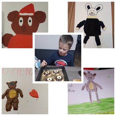 25 listopada w naszej szkole podczas zajęć zdalnych obchodzony był Światowy Dzień Pluszowego Misia. Trzecioklasiści wyczarowali piękne portrety niedźwiadków. Pojawiły się nawet przepyszne misiowe ciasteczka. Przed komputerami razem z uczniami, zasiadły pluszowe misie. Dzieci poznały historię pluszowego niedźwiadka. Opowiadały o swoich ukochanych przytulankach. Nie ma chyba dziecka, które nie miałoby swojego puszystego przyjaciela, z którym się bawi i któremu powierza swoje najskrytsze tajemnice.