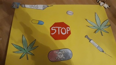 Na zajęciach świetlicowych uczniowie brali udział w pogadankach dotyczących uzależnień. Jednym z tematów była narkomania, jej objawy, skutki i przyczyny. Finałem był plakat przygotowany przez uczennicę klasy siódmej.