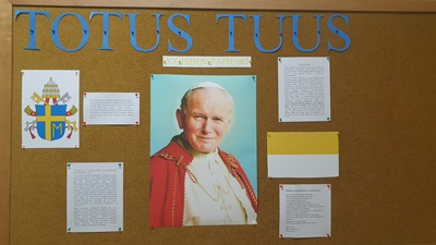 W tym roku przypada setna rocznica narodzin papieża Jana Pawła II. Z tej okazji również nasza szkoła zaakcentowała tę rocznicę w postaci gazetki szkolnej. Przypadający zawsze na miesiąc październik Dzień Papieski był już XX takim dniem obchodzonym w Polsce i przebiegał pod hasałem „TOTUS TUUS”. Szkolna gazetka, na której pojawił się obraz świętego Jana Pawła II, herb papieski oraz papieska flaga zawiera również interpretację owego hasła oraz modlitwę za wstawiennictwem świętego Jana Pawła II.