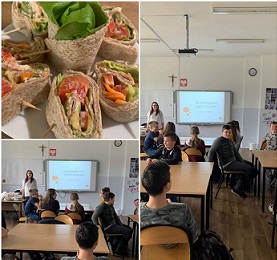 W poniedziałek (09.12.2019) odbyło się w naszej szkole spotkanie z dietetykiem. W warsztatach dotyczących zdrowego odżywiania uczestniczyli uczniowie klas: VII, VIII. Podczas nich młodzież dowiedziała się jakich produktów spożywczych unikać, a jakich spożywać najwięcej. Zostali zapoznani z piramidą zdrowego odżywiania, negatywnymi skutkami spożywania cukru oraz nieocenionym wpływem warzyw i owoców na pracę naszych narządów i polepszanie naszego samopoczucia. Po części teoretycznej uczniowie dostali kilka zadań do wykonania: rozpoznanie przypraw, przygotowanie zdrowego jadłospisu na obiad, kolację i spotkanie ze znajomymi. Uczniowie mieli również możliwość przygotowania zdrowych przekąsek we własnym zakresie wykonali zdrowe, pełnoziarniste wrapy z warzywami.
